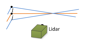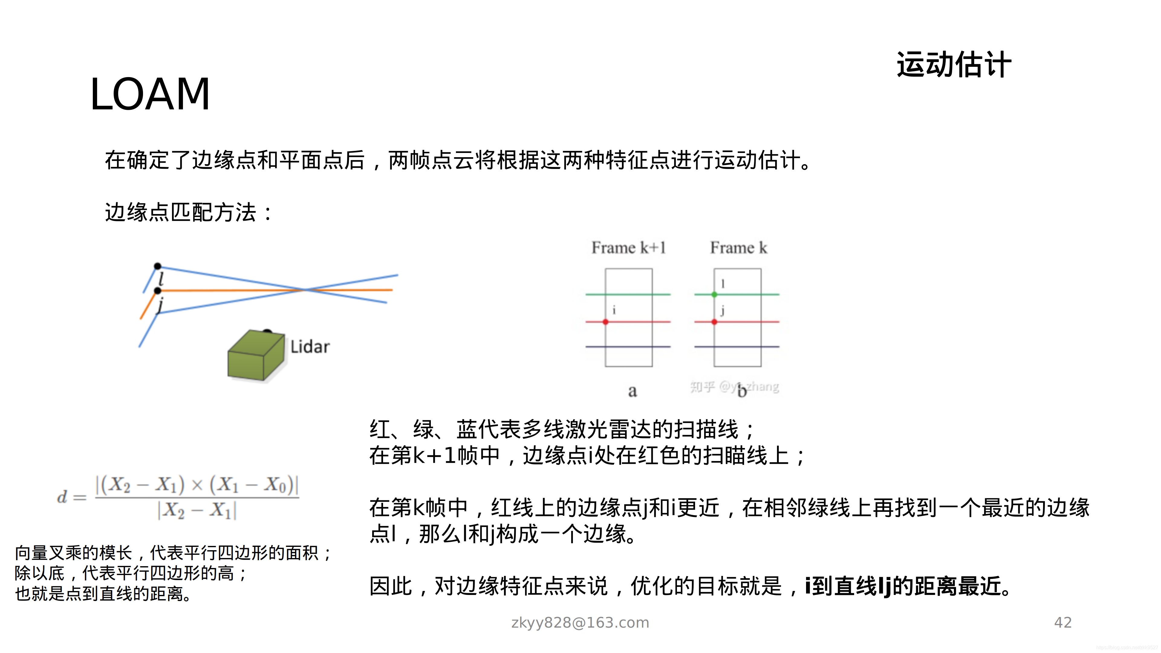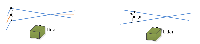 在第k帧中,红线上的边缘点j和i更近,在相邻绿线上再找到一个最近的边缘点l,那么l和j构成一个边缘。 因此,对边缘特征点来说,优化的目标就是,i到直线lj的距离最近。