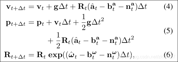 (4)~(6) 分别表示t + ∆t 时间内,IMU的速度、位移和旋转; 注意,并非直接用原始数据积分,而是减去了随机游走b和高斯白噪声n。 bias未知,该变量也参与优化;
