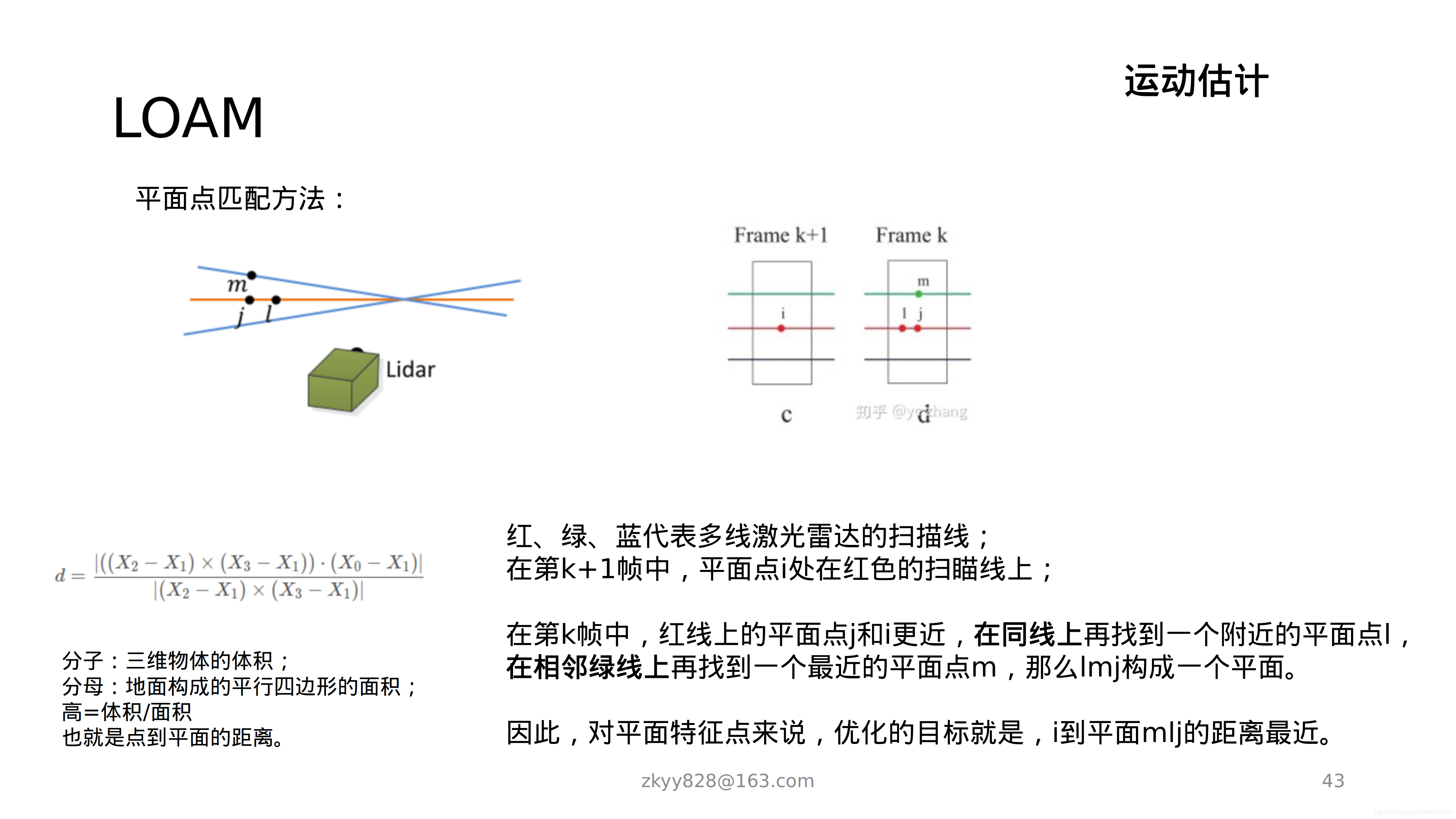 红、绿、蓝代表多线激光雷达的扫描线; 在第k+1帧中,平面点i处在红色的扫瞄线上; 在第k帧中,红线上的平面点j和i更近,在同线上再找到一个附近的平面点l,在相邻绿线上再找到一个最近的平面点m,那么lmj构成一个平面。 因此,对平面特征点来说,优化的目标就是,i到平面mlj的距离最近。