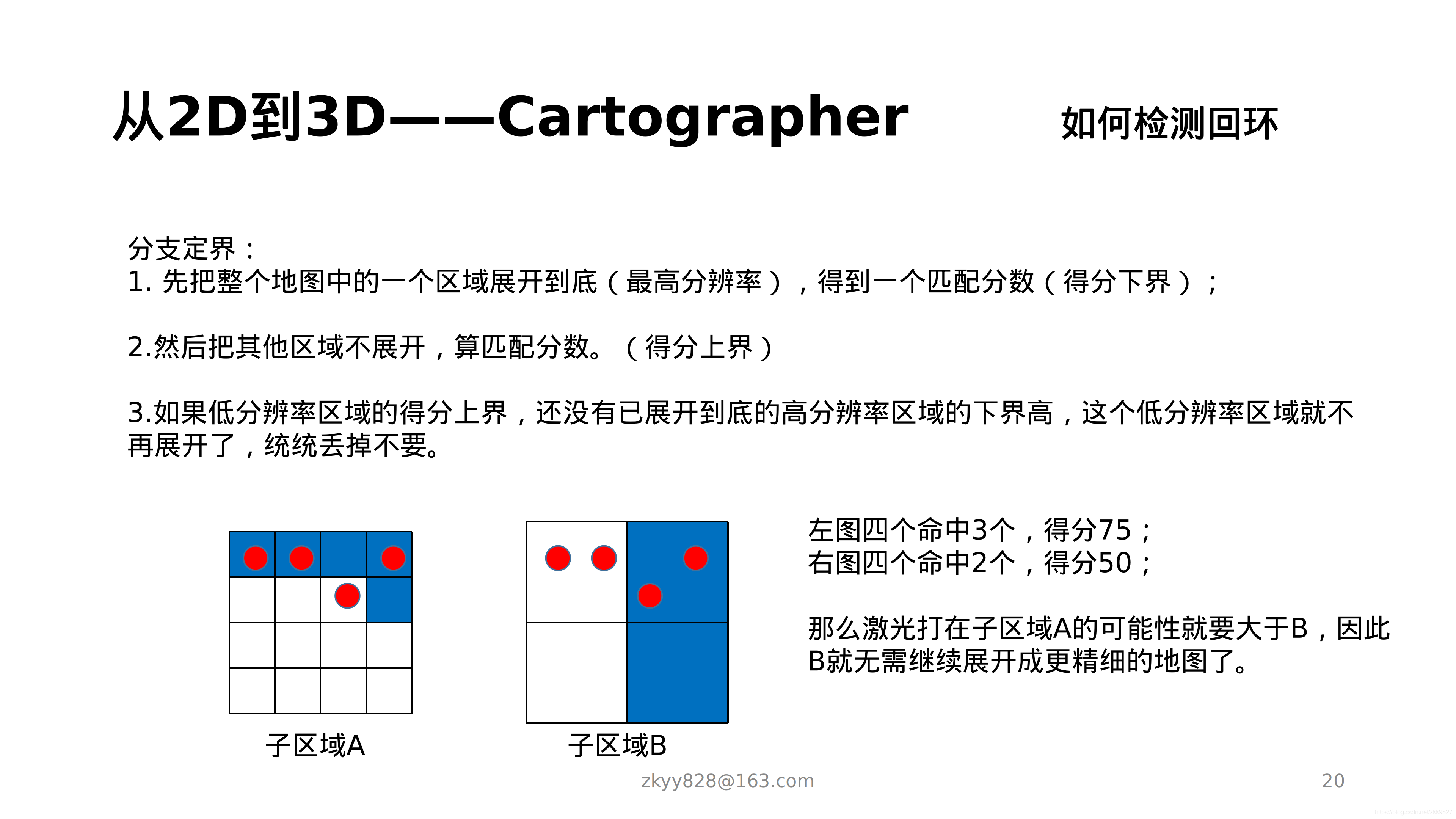 分支定界: 先把整个地图中的一个区域展开到底(最高分辨率),得到一个匹配分数(得分下界); 然后把其他区域不展开,算匹配分数。(得分上界) 如果低分辨率区域的得分上界,还没有已展开到底的高分辨率区域的下界高,这个低分辨率区域就不再展开了,统统丢掉不要。