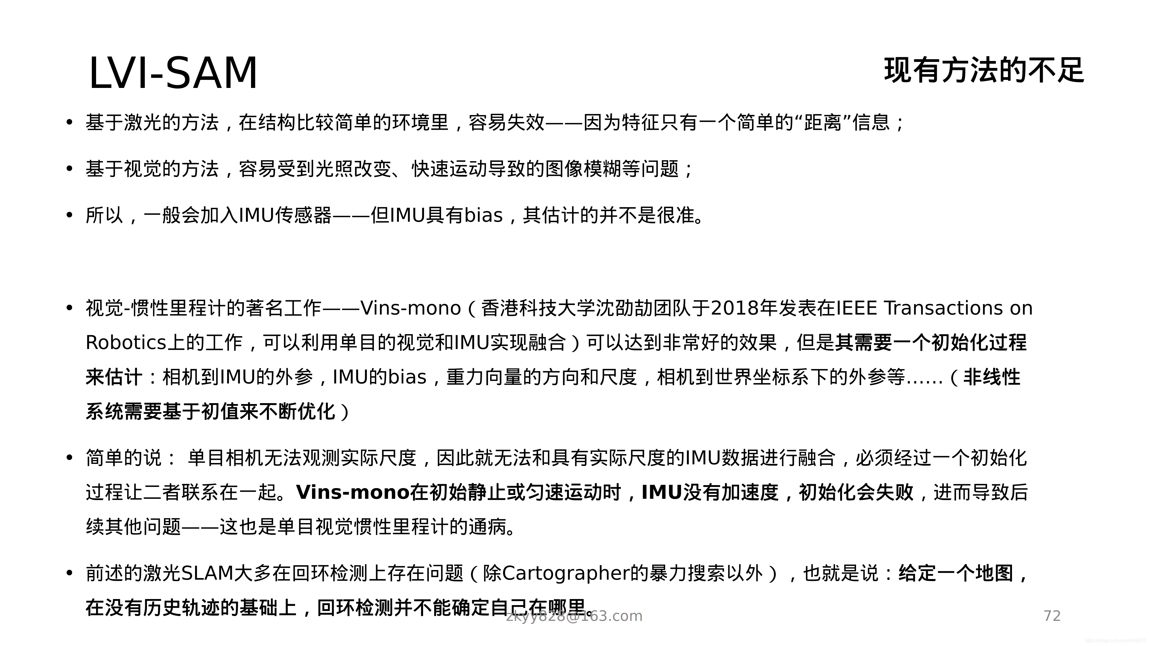 简单的说: 单目相机无法观测实际尺度,因此就无法和具有实际尺度的IMU数据进行融合,必须经过一个初始化过程让二者联系在一起。Vins-mono在初始静止或匀速运动时,IMU没有加速度,初始化会失败,进而导致后续其他问题——这也是单目视觉惯性里程计的通病。 前述的激光SLAM大多在回环检测上存在问题(除Cartographer的暴力搜索以外),也就是说:给定一个地图,在没有历史轨迹的基础上,回环检测并不能确定自己在哪里。