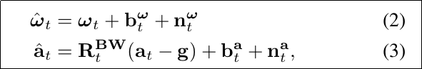 (2)~(3) :IMU可以测量自身的加速度和角速度,但一般认为其测量数据包括了两大噪声:随机游走噪声 b + 高斯白噪声n。B表示body坐标系,即imu坐标系;W表示世界坐标系,R^BW表示了从世界坐标系转换至IMU坐标系;
