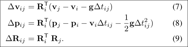 (7)~(8)为i到j时刻的预积分,即把它作为两时刻位姿的一个约束,参与整体的图优化过程。