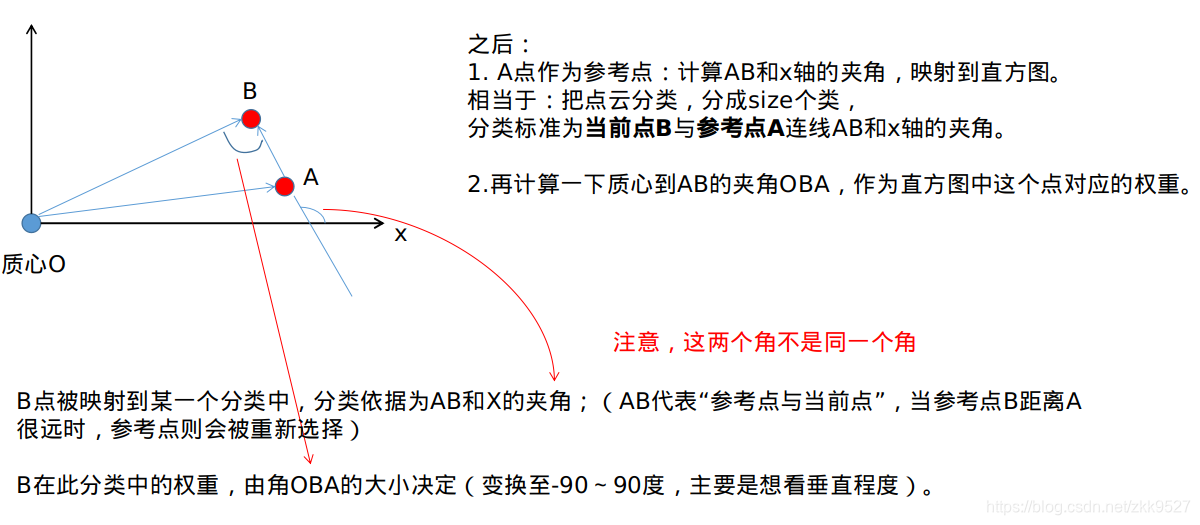 之后: 1. A点作为参考点:计算AB和x轴的夹角,映射到直方图。 相当于:把点云分类,分成size个类, 分类标准为当前点B与参考点A连线AB和x轴的夹角。 2.再计算一下质心到AB的夹角OBA,作为直方图中这个点对应的权重。