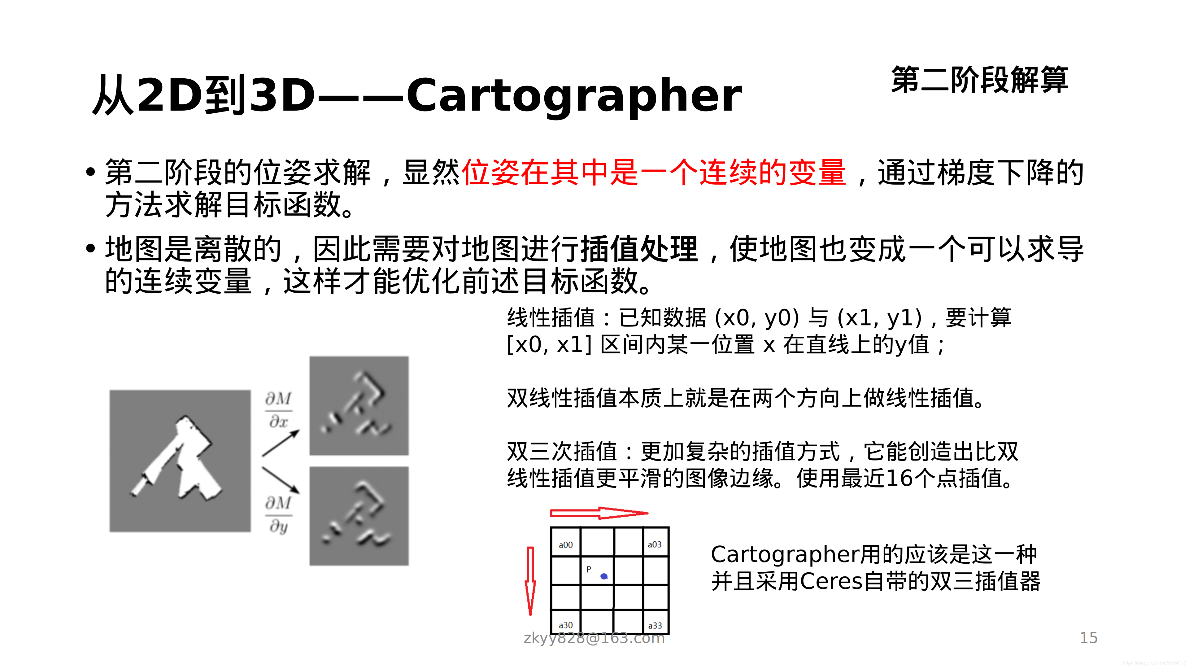 第二阶段的位姿求解,显然位姿在其中是一个连续的变量,通过梯度下降的方法求解目标函数。由于地图是离散的,因此需要对地图进行插值处理,使地图也变成一个可以求导的连续变量,这样才能优化前述目标函数。
