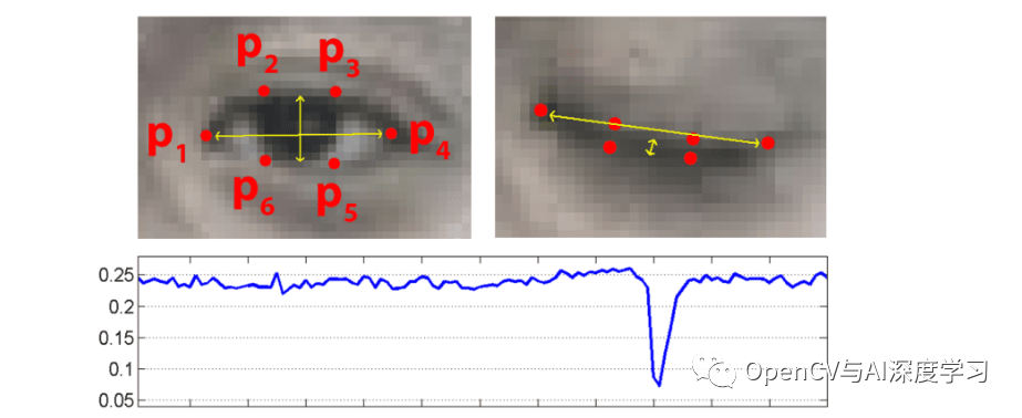 底部:为视频序列的几帧绘制的眼睛纵横比 EAR。存在一个闪烁。