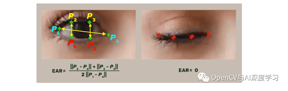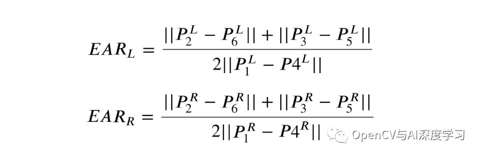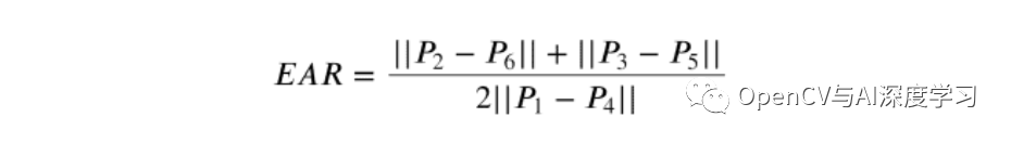 要检测眼睛是否闭合,我们可以使用眼睛纵横比(EAR) 公式: