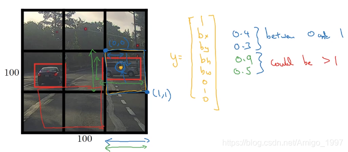 所以目标图像的输出是3×3×8,3×3就代表划分的格子,如果一开始是19×19个格子,则最后输出是19×19×8,注意这里统一只需要计算一次卷积神经网络,原因如上滑动窗口的卷积实现。(所以划分的格子数不会影响计算速度)