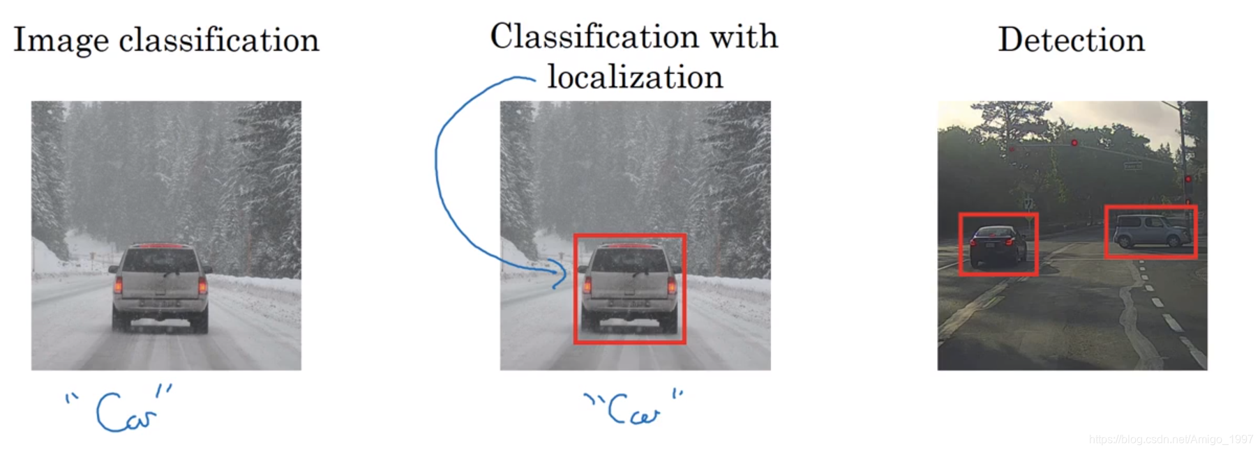 定位:不仅要用算法判断图片是不是汽车,还需要在图片中标记它的位置。