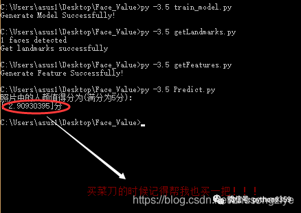 # 颜值预测脚本from sklearn.externals import joblibimport numpy as npfrom sklearn import decomposition pre_model = joblib.load('./model/face_rating.pkl')features = np.loadtxt('./data/features_ALL.txt', delimiter=',')my_features = np.loadtxt('./results/my_features.txt', delimiter=',')pca = decomposition.PCA(n_components=20)pca.fit(features)predictions = []if len(my_features.shape) > 1: for i in range(len(my_features)): feature = my_features[i, :] feature_transfer = pca.transform(feature.reshape(1, -1)) predictions.append(pre_model.predict(feature_transfer)) print('照片中的人颜值得分依次为(满分为5分):') k = 1 for pre in predictions: print('第%d个人:' % k, end='') print(str(pre)+'分') k += 1else: feature = my_features feature_transfer = pca.transform(feature.reshape(1, -1)) predictions.append(pre_model.predict(feature_transfer)) print('照片中的人颜值得分为(满分为5分):') k = 1 for pre in predictions: print(str(pre)+'分') k += 1使用演示