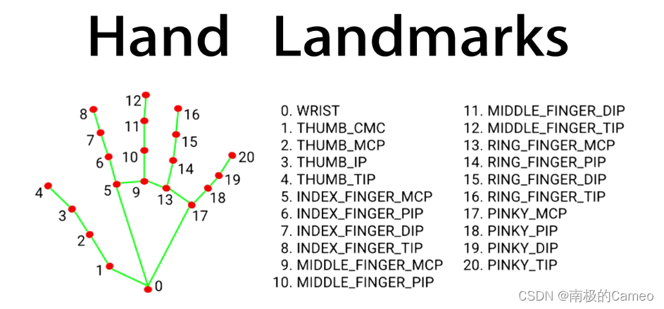 MediaPipe Hand Tracking模型可以精准地检测手的21个关键点,这些点包括: