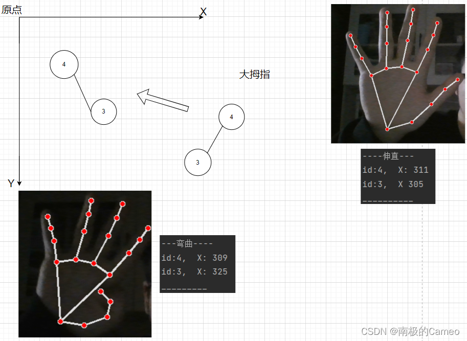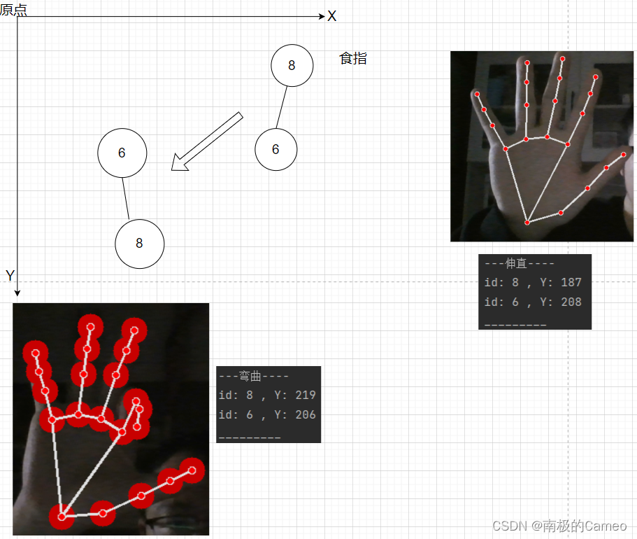 这里手势识别的原理是:根据手部关键点的坐标位置,来判断手部姿态(手指弯曲或者伸直)。大拇指比较特殊,和其余四指的弯曲方向不同。大拇指可以依靠X坐标,比较第4点和第3点的X值,来判断是否弯曲;其余四指可以依靠Y坐标,比如食指比较第8点和第6点的Y值,来判断是否弯曲。如下图所示: