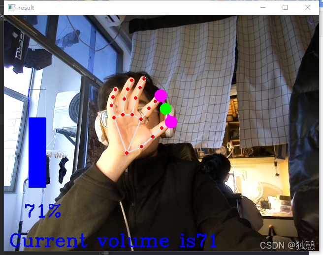 vol = int((length) / len_max * 100)hands = mp_hands.Hands( min_detection_confidence=0.5, min_tracking_confidence=0.5)cap = cv2.VideoCapture(0)len_max = 0len_min = 0num = 0 while cap.isOpened(): stop = datetime.datetime.now() + datetime.timedelta(seconds=5) if num == 0: while datetime.datetime.now() < stop: success, image = cap.read() if not success: print("camera frame is empty!") continue image = cv2.cvtColor(cv2.flip(image, 1), cv2.COLOR_BGR2RGB) image.flags.writeable = False results = hands.process(image) image.flags.writeable = True image = cv2.cvtColor(image, cv2.COLOR_RGB2BGR) if results.multi_hand_landmarks: for hand_landmarks in results.multi_hand_landmarks: mp_drawing.draw_landmarks( image, hand_landmarks, mp_hands.HAND_CONNECTIONS) normalized_landmarks = Normalize_landmarks(image, hand_landmarks) image, length = Draw_hand_points(image, normalized_landmarks) if length>len_max: len_max = length strRate = 'Start calibration' cv2.putText(image, strRate, (10, 410), cv2.FONT_HERSHEY_COMPLEX, 1.2, (255, 0, 0), 2) strRate1 = 'max length = %d'%len_max cv2.putText(image, strRate1, (10, 110), cv2.FONT_HERSHEY_COMPLEX, 1.2, (255, 0, 0), 2) cv2.imshow('result', image) if cv2.waitKey(5) & 0xFF == 27: break num = 1 success, image = cap.read() if not success: print("camera frame is empty!") continue image = cv2.cvtColor(cv2.flip(image, 1), cv2.COLOR_BGR2RGB) image.flags.writeable = False results = hands.process(image) image.flags.writeable = True image = cv2.cvtColor(image, cv2.COLOR_RGB2BGR) if results.multi_hand_landmarks: for hand_landmarks in results.multi_hand_landmarks: mp_drawing.draw_landmarks( image, hand_landmarks, mp_hands.HAND_CONNECTIONS) normalized_landmarks = Normalize_landmarks(image, hand_landmarks) try: image, length = Draw_hand_points(image, normalized_landmarks) # print(length) #20~300 cv2.rectangle(image, (50, 150), (85, 350), (255, 0, 0), 1) if length >len_max: length = len_max vol = int((length) / len_max * 100) volume.SetMasterVolumeLevel(vol_tansfer(vol), None) cv2.rectangle(image, (50, 150+200-2*vol), (85, 350), (255, 0, 0), cv2.FILLED) percent = int(length / len_max * 100) # print(percent) strRate = str(percent) + '%' cv2.putText(image, strRate, (40, 410), cv2.FONT_HERSHEY_COMPLEX, 1.2, (255, 0, 0), 2) vol_now = vol_tansfer_reverse(volume.GetMasterVolumeLevel()) strvol = 'Current volume is'+str(vol_now) cv2.putText(image, strvol, (10, 470), cv2.FONT_HERSHEY_COMPLEX, 1.2, (255, 0, 0), 2) except: pass cv2.imshow('result', image) if cv2.waitKey(10) & 0xFF == ord('q'): len_max = 0 num = 0 if cv2.waitKey(10) & 0xFF == 27: breakcv2.destroyAllWindows()hands.close()cap.release()最后,敲入"q"可以重新标定,敲入"esc"可以退出。