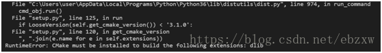 以上是正确的安装流程。如果先安装Dlib,会报如下错误:(截取最后几行):