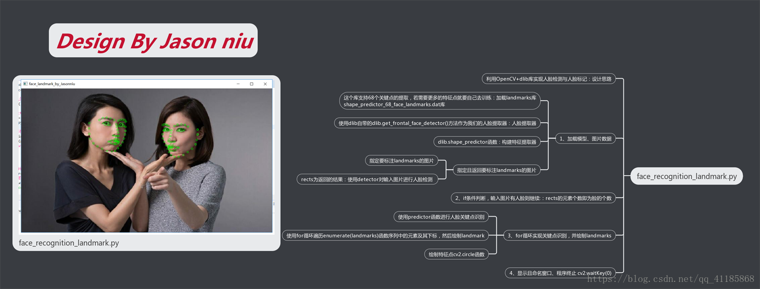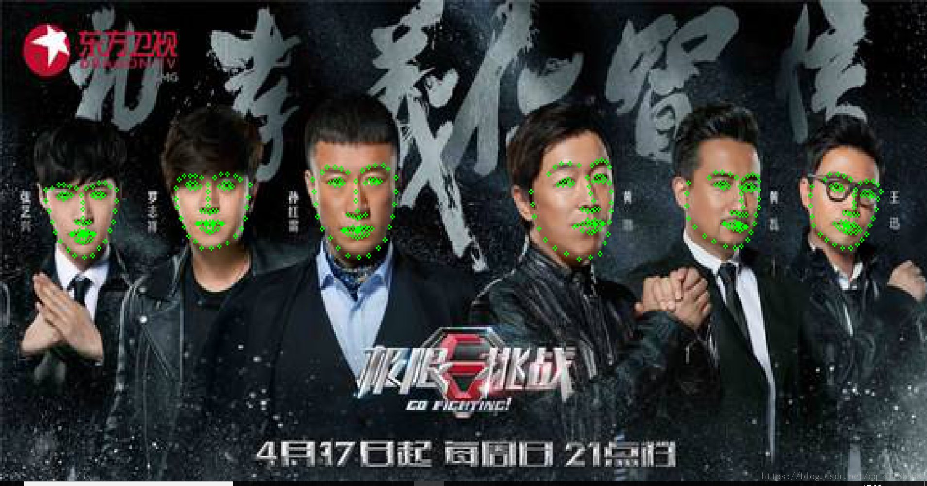 import cv2import dlibimport numpyimport sys PREDICTOR_PATH = "F:\File_Python\Resources\shape_predictor_68_face_landmarks.dat" detector = dlib.get_frontal_face_detector() predictor = dlib.shape_predictor(PREDICTOR_PATH) class NoFaces(Exception): pass im = cv2.imread("F:\File_Python\Resources\Allstart.jpg") rects = detector(im,1) if len(rects) >= 1: print("{} faces detected".format(len(rects))) if len(rects) == 0: raise NoFaces for i in range(len(rects)): landmarks = numpy.matrix([[p.x,p.y] for p in predictor(im,rects[i]).parts()]) im = im.copy() for idx,point in enumerate(landmarks): pos = (point[0,0],point[0,1]) #cv2.putText(im,str(idx),pos, #fontFace=cv2.FONT_HERSHEY_SCRIPT_SIMPLEX, #fontScale=0.4, #color=(0,0,255)) cv2.circle(im,pos,0.5,color=(0,255,0)) cv2.namedWindow("im",2)cv2.imshow("im",im)cv2.waitKey(0)Landmark人脸68个关键点检测dat模型库(shape_predictor_68_face_landmarks.dat)