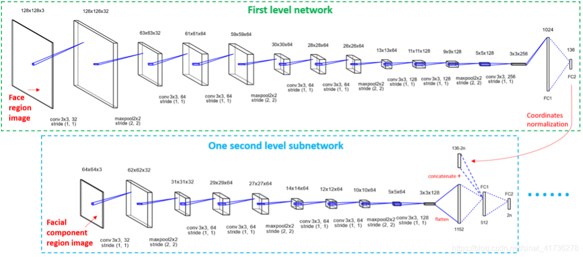 First level network输入一个3通道128x128的人脸图片,输出一个136个元素的array代表着全脸的68个关键点的坐标。面部要素的bbox由这些坐标来确定。原始的人脸图片根据bbox剪裁,resize到64x64,然后传到第二层子网络中作为局部信息来进行关键点的微调。应当注意,对于裁剪的分量区域图像,设置了最大纵横比2:1。如果在训练和测试中都超过了最大比率,则区域图像的较短边将被迫延伸以保持合理的纵横比以获得更好的性能。