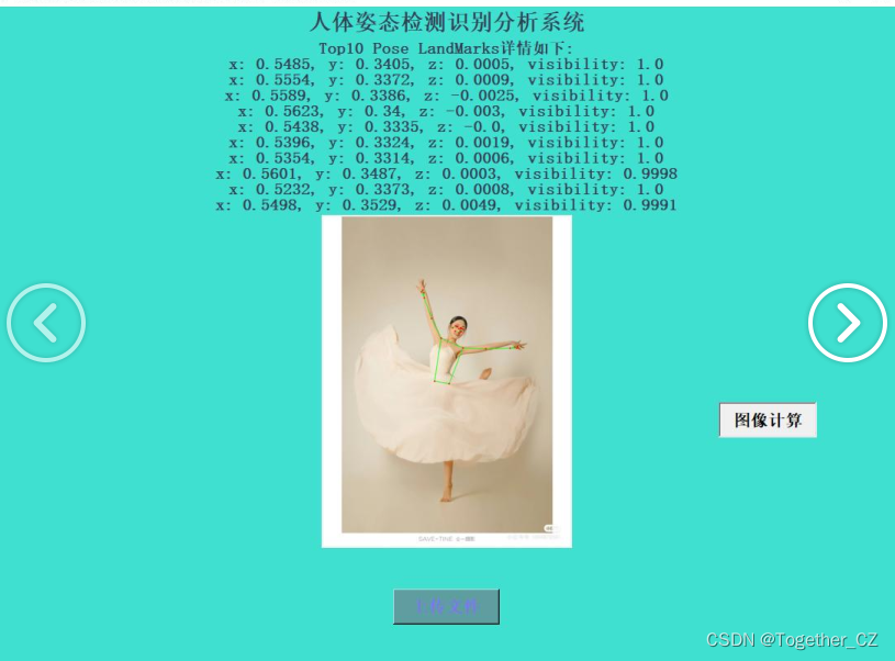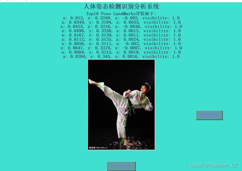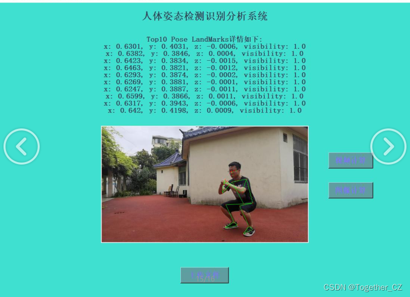 x: 0.8632, y: 0.3993, z: -0.0021, visibility: 1.0x: 0.8844, y: 0.3873, z: 0.0057, visibility: 1.0x: 0.893, y: 0.3897, z: -0.0025, visibility: 1.0x: 0.9014, y: 0.3921, z: 0.0008, visibility: 1.0x: 0.8574, y: 0.3781, z: 0.0035, visibility: 1.0x: 0.8468, y: 0.3745, z: 0.0035, visibility: 1.0x: 0.8365, y: 0.3712, z: -0.003, visibility: 1.0x: 0.8934, y: 0.3997, z: -0.001, visibility: 1.0x: 0.8057, y: 0.3715, z: 0.0004, visibility: 1.0x: 0.858, y: 0.4187, z: 0.0001, visibility: 1.0x: 0.8242, y: 0.4063, z: 0.0045, visibility: 1.0x: 0.8442, y: 0.5036, z: -0.2557, visibility: 1.0x: 0.6965, y: 0.3903, z: -0.248, visibility: 1.0x: 0.8154, y: 0.6286, z: -0.5367, visibility: 0.9983x: 0.5674, y: 0.3786, z: -0.5087, visibility: 0.9612x: 0.814, y: 0.5123, z: -0.5489, visibility: 0.9992x: 0.6818, y: 0.3975, z: -0.6003, visibility: 0.9928x: 0.8134, y: 0.4816, z: -0.5735, visibility: 0.9981x: 0.7153, y: 0.4054, z: -0.6816, visibility: 0.9834x: 0.8223, y: 0.4749, z: -0.5469, visibility: 0.9979x: 0.7317, y: 0.4011, z: -0.6465, visibility: 0.976x: 0.8099, y: 0.487, z: -0.5443, visibility: 0.9977x: 0.7143, y: 0.4026, z: -0.6356, visibility: 0.973x: 0.5461, y: 0.5851, z: -0.0928, visibility: 0.9991x: 0.5087, y: 0.4855, z: 0.0427, visibility: 0.9999x: 0.5612, y: 0.7204, z: -0.2463, visibility: 0.9889x: 0.422, y: 0.344, z: -0.394, visibility: 0.9973x: 0.5203, y: 0.8794, z: -0.1586, visibility: 0.9324x: 0.3191, y: 0.1732, z: -0.1891, visibility: 0.9998x: 0.4913, y: 0.9077, z: -0.2176, visibility: 0.9067x: 0.2699, y: 0.1454, z: -0.2992, visibility: 0.9998x: 0.5701, y: 0.9116, z: -0.3479, visibility: 0.9283x: 0.3814, y: 0.0982, z: -0.4874, visibility: 0.9996之后开发专用的可视化界面实现可视化推理如下所示:
