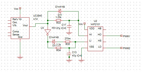 实现方式,UC3843的PWM输出用逻辑非门芯片取反,然后利用RCD做死区,经驱动IC HIP2101(仿真软件自带驱动芯片模型),得到两路带死区的互补驱动信号PWM1和PWM2,如下图所示: