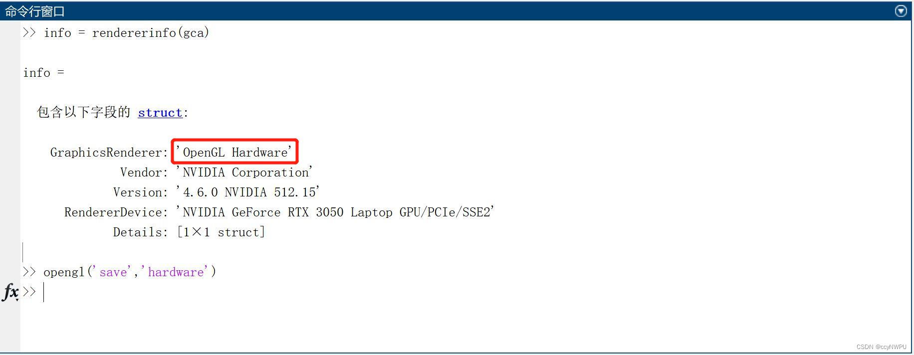 info = rendererinfo(gca)根据输出的结果,看自己的MATLAB 使用的是硬件加速 OpenGL ,还是软件 OpenGL。