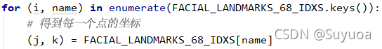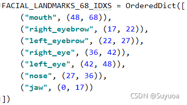 定义68点的位置,上面有介绍过对应68点的位置,这里使用到了OrderedDict,它是一个单独的类,我们在这里举个例子