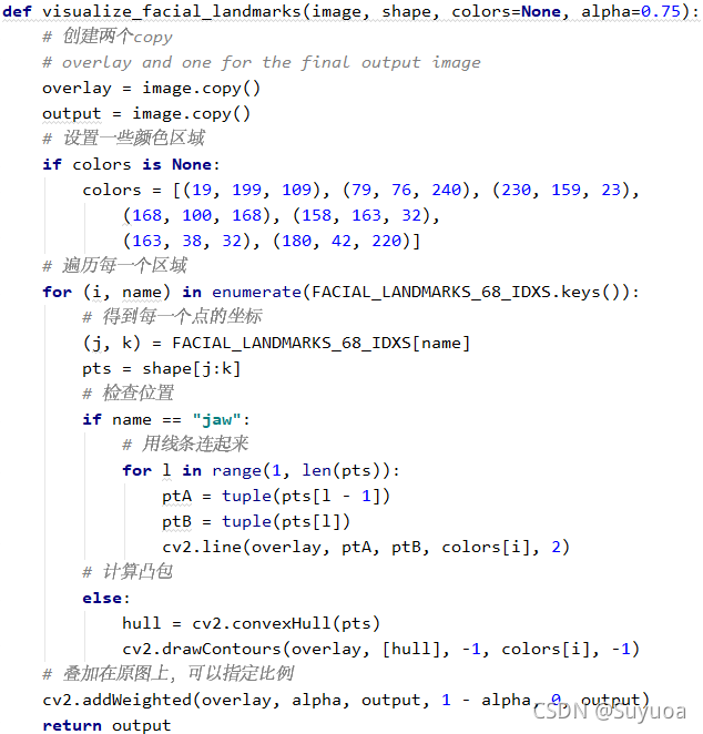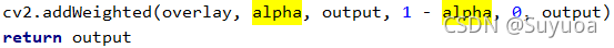全部画完之后我们将overlay与output进行 图像融合 ,比例为overlay 0.75,alpha 0.25,将融合后的图像赋值给output,最后返回融合后的图像