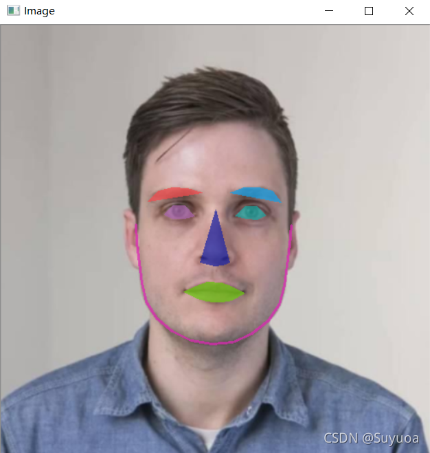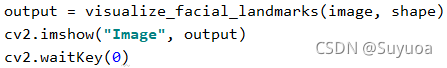 遍历结束后,我们将原图像与shape(大小为68*2的关键点坐标)传给visualize_facial_landmarks()进行多边形绘制,之后展示出来