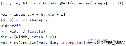之后将从i-j的点拟合成轮廓,赋值给(x,y,w,h),之后我们截取这个矩形的地方,然后把它的宽变为250,宽高比与轮廓矩形相同的图像