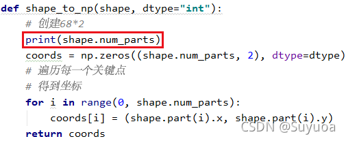 传入的参数shape是一个检测好的人脸关键点对象,我们在这个函数中进行处理,进入函数后我们下面会用到shape.num_parts这个方法,我们提前打印出来看一下