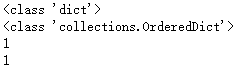 a = {'a':1,'c':2,'b':3}print(type(a))from collections import OrderedDictb = OrderedDict([('a',1),('c',2),('b',3)])print(type(b))#调用的方式与和普通字典调用方式相同print(a['a'])print(b['a'])