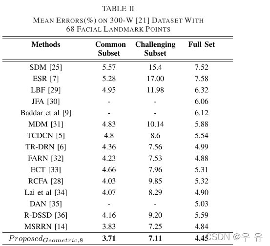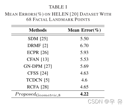为了验证该方法的有效性,我们将其性能与最近提出的其他方法进行了比较。表一显示了HELEN数据集上68个面部标志点的平均误差比较。通过标准化的眼间距[5]、[6]、[9]、[26]、[30]测量平均误差人脸对齐算法常用评价标准总结 。表I中的ProposeGeometric,8显示了通过几何对抗学习和8个卷积层。表一显示,所提出的方法与其他方法的性能相当。TCDCN(4.60%)在MAFL[5]数据库中使用预先训练的网络。RCFA(4.65%)利用递归神经网络进行人脸对齐。与这些方法相比,该方法的性能提高了4.22%