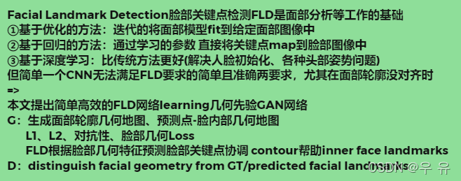 先前的方法通常使用L1或L2损失来训练网络,因此通过减少人脸标记的注释点annotated points和预测点之间的pix到pix差异来优化网络。在几何上,面部标志点通过面部形状和结构而相互连接。在基于深度学习的FLD中,需要预测与面部形状和结构来匹配面部标志点。