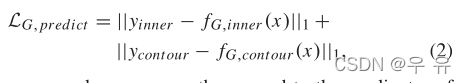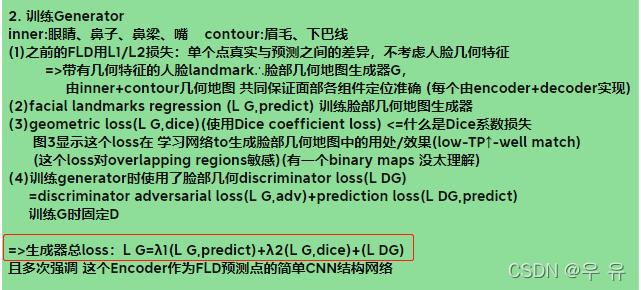 为了训练面部几何地图生成器,使用以下目标函数:使用面部地标回归损失(表示为asLG,predict)。它可以写成如下公式(2)所示,其中,InNeral和YContour分别是内部和轮廓面部地标的地面真实坐标。