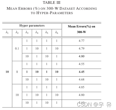 在训练提议的网络时,我们使用了六个超参数来平衡等式(4)、等式(9)和等式(10)中的损失。为了了解超参数的持续性,在300-W数据集上使用不同的超参数集进行了实验。超参数的选择如下所示: