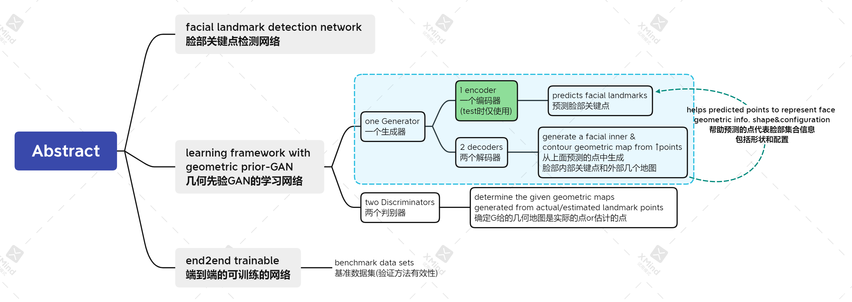 人脸标志点检测在人脸分析任务中起着重要作用。此外,它是许多人脸相关应用的先决条件,其简单性和有效性在人脸地标检测中至关重要。在本文中,我们提出了一个有效的人脸地标检测网络和一个与几何先验生成对抗网络相关的学习框架。几何先验生成对抗网络由一个发生器和两个鉴别器组成。该发生器由一个编码器和两个解码器组成。编码器预测面部标志点。解码器根据预测的地标点生成面部内部和轮廓几何图。从预测的地标点生成人脸几何地图有助于预测的地标点表示人脸几何信息,包括形状和配置。鉴别器确定给定的几何地图是从实际的地标点或估计的地标点生成的。我们提出的网络是端到端可训练的,并且在测试阶段仅使用编码器部分作为面部地标检测器。为了验证该方法的有效性,我们使用基准数据集进行了综合实验。结果表明,与最近提出的人脸地标检测方法相比,该方法具有简单有效的人脸地标检测网络,具有相当的性能。