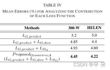 为了验证该方法中几何损失和人脸几何鉴别器损失的有效性,进行了三个实验。第一个实验是用lg,predict训练人脸标志估计量。 第二个实验是用LG训练人脸几何地图生成器,预测LG,骰子。这是一个验证几何损失影响的实验。最后一个实验是用LG训练人脸几何图生成器,预测LDG。这是一个验证人脸几何鉴别器丢失效果的实验。