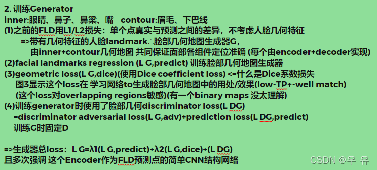 其中λ1,λ2表示控制每个损失函数的超参数。我们将这些参数设置为λ1=10,λ2=1。在人脸几何贴图生成器的训练过程中,鉴别器参数是固定的,仅更新生成器参数。 为了最小化LDG,生成器尝试生成精确的面几何贴图。为了生成精确的人脸几何地图,编码器需要估计出能够很好地反映人脸几何特征的人脸标志点。因此,该编码器可以作为FLD,与人脸几何信息协同预测人脸标志点。