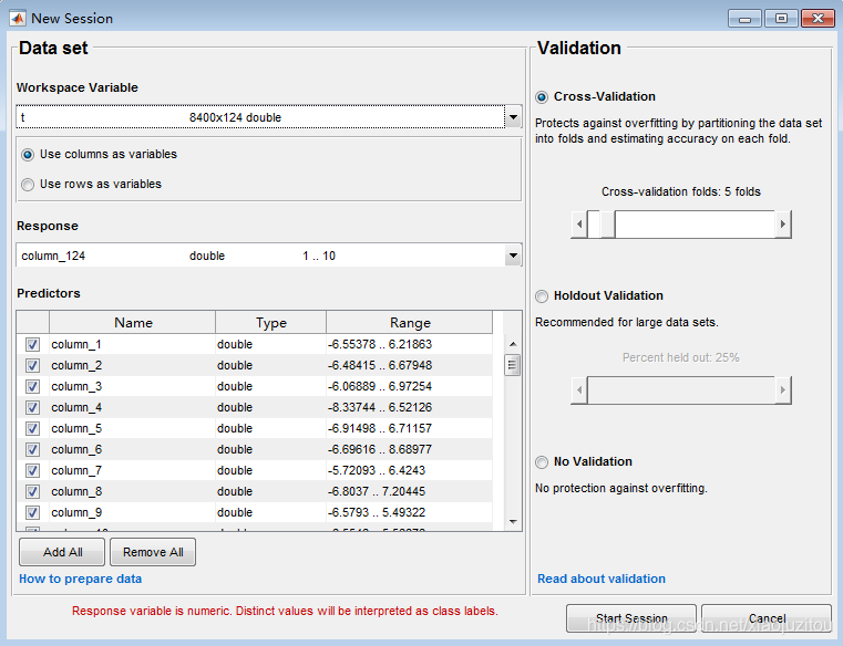 3.我选择的是from workspace,我的训练集数目为8400,注意我选择的变量t是8400*124的矩阵(8400*123的训练数据和8400*1的标签组成的),导入时工具箱会自动拆分。我这里其他选项默认,然后选择start session 。