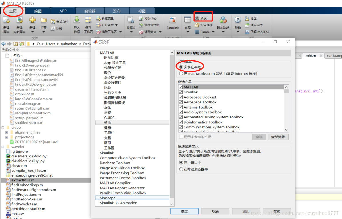 解决方法:在Matlab中点击Home(中文版主页),在右上角找到 Preferences( 中文 版的是预设),点击,然后在弹出的对话框的左侧栏选择Help,然后在右侧选择 Installed Locally(中文版安装本地),点击OK即可,问题解决~ ,如下图所示。