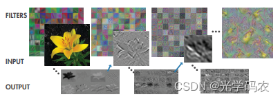 这三种操作在几十层或几百层上反复进行,每一层都学习检测不同的特征。