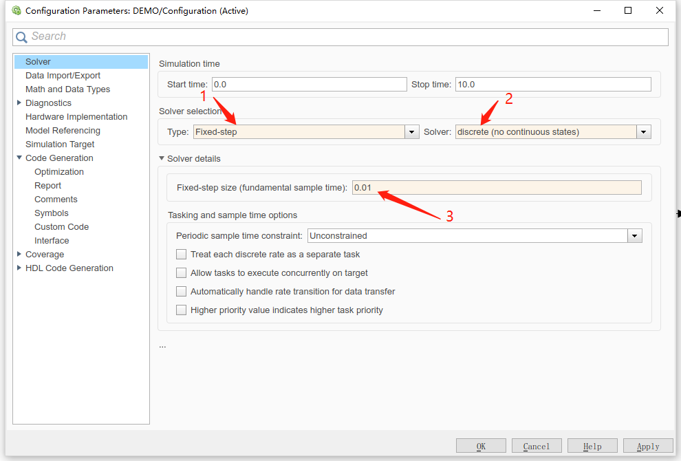 因为我们生成的代码是需要下载到单片机中的,而单片机中的计时是按照它的频率严格进行的,因此求解器中的求解步长要与单片机的步长一致,否则就会出错,所以这里将求解器 类 型改为定步长,离散,步长时间设置为0.01s(即10ms)。