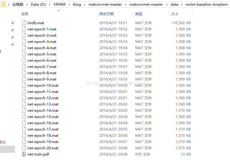 save('..\\..\\data\\mnist-baseline-simplenn\\net.mat', '-struct', 'net');执行后可以看到mnist-baseline-simplenn目录下多了一个net.mat文件,后面我们需要用到imdb.mat和net.mat。