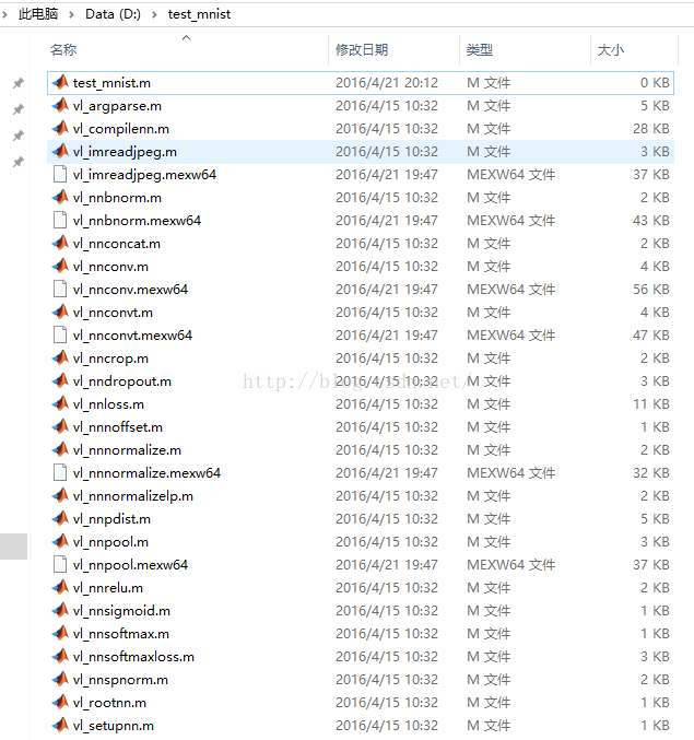 这里需要注意一下,vl_setupnn这个函数其实就是把matlab文件夹下的所有子文件夹的路径加到matlab的路径变量中,类似VS里设置头文件目录的概念,所以为了简便,我们直接把matlab下的.m文件和matlab\mex下的.mex64文件拷贝到一个文件夹里,我直接放在D盘下的test_mnist文件夹下,并新建了一个空的文件test_mnist.m,如下图所示: