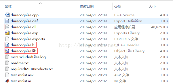 编译完成后,在当前目录下会生成不少文件,我们主要关注三个(dnrecognize.dll,dnrecognize.h,dnrecognize.lib):