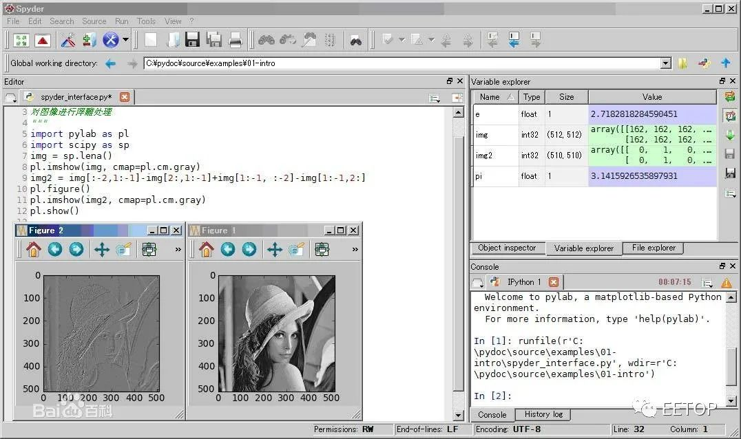Spyder的界面由许多窗格构成,用户可以根据自己的喜好调整它们的位置和大小。当多个窗格出现在一个区域时,将使用标签页的形式显示。例如在图1中,可以看到“Editor”、“Object inspector”、“Variable explorer”、“File explorer”、“Console”、“History log”以及两个显示图像的窗格。在View菜单中可以设置是否显示这些窗格。