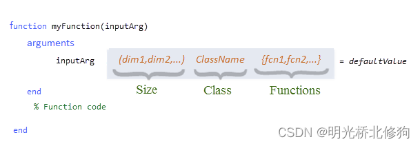 如果想输入单个元素参数Size段应该为(1,1),如果想输入向量则应该为(1,:),这里的接受参数可以是1 * n也可以是n * 1,自动转置。Class指定输入的参数必须是指定类,或者可以转化为指定类