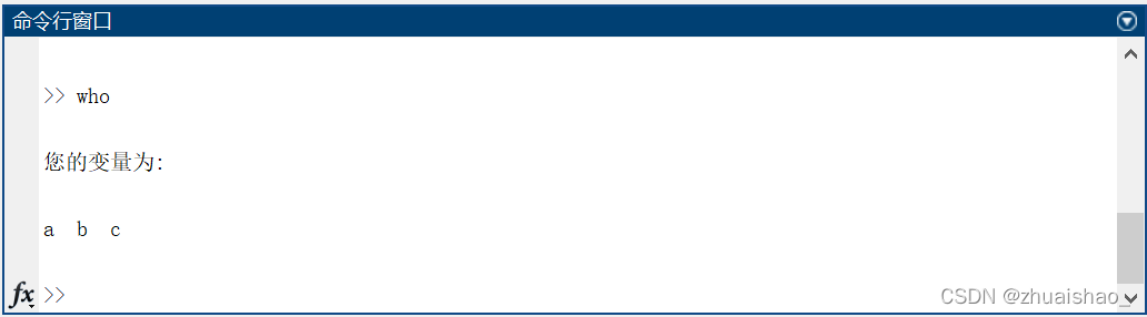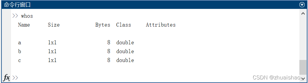 | whos | 列出当前工作空间的所有变量的详细信息 |