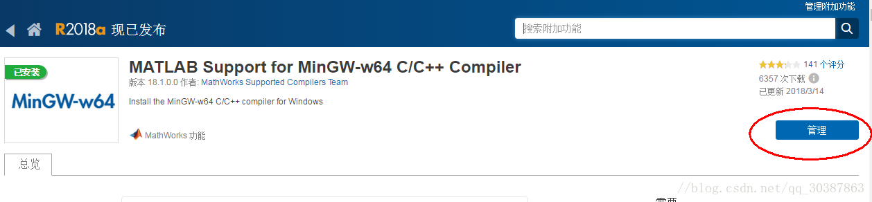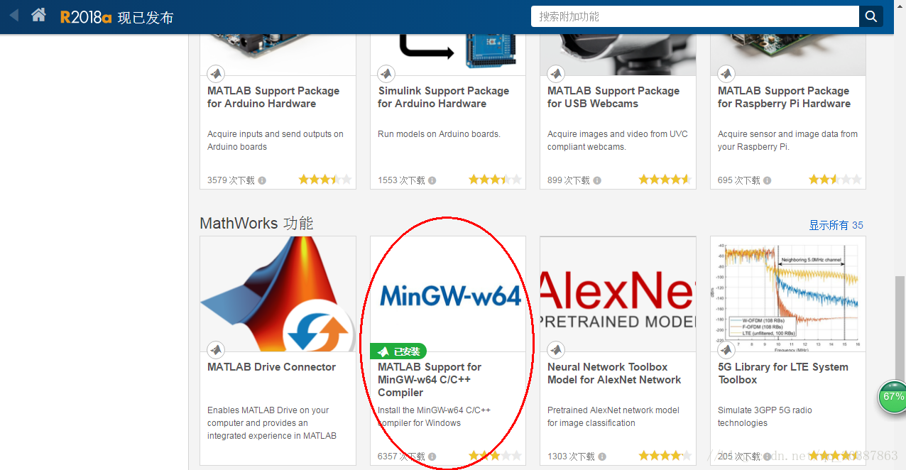 没有安装“MinGW-w64”,圈里显示的应该是“安装”,直接点击“安装”,matlab就会自动帮你安装“MinGW-w64”了,
