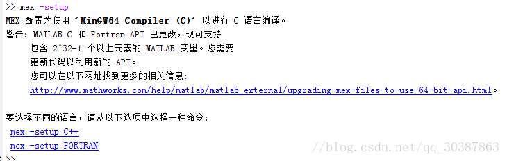 在matlab命令窗口输入 mex -setup 回车:(注意 mex 和-setup中间有个空格 )