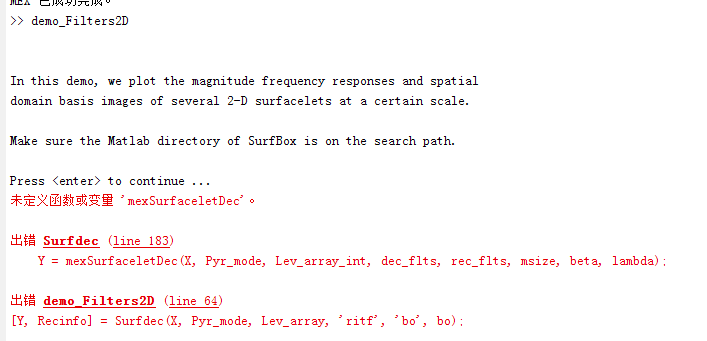 2、运行mexcompile .m文件没有错误的话,查看SurfBox \ matlab 文件夹下有没有 mexSurfaceletDec.mexw64 等三个文件