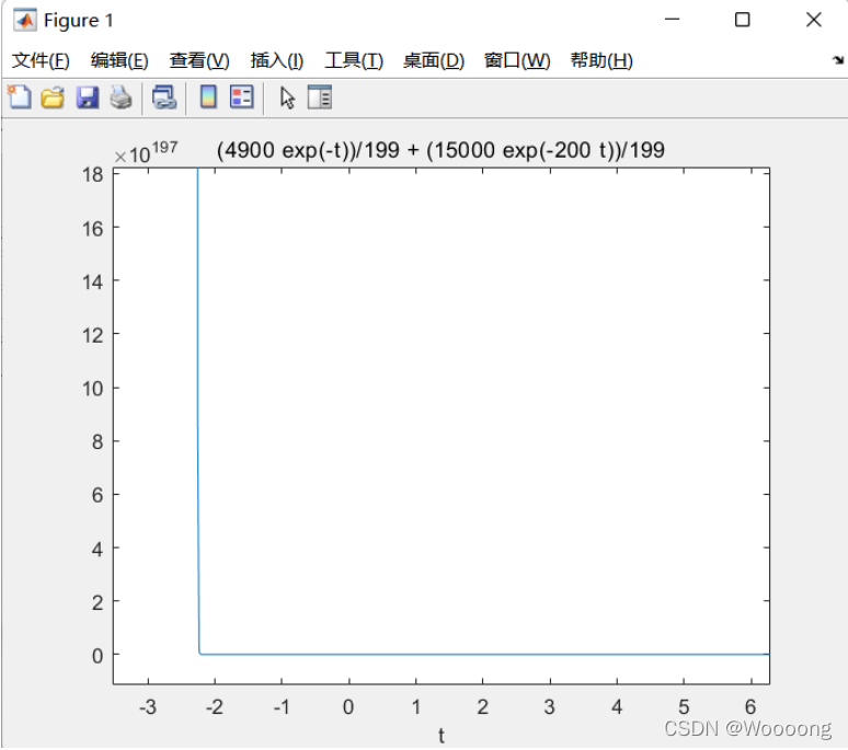syms s;F = 100*(s+50)/(s^2+201*s+200); %s域函数F(s)f = ilaplace(F);disp(f); %输出函数ezplot(f); %画出f(t)函数图像
